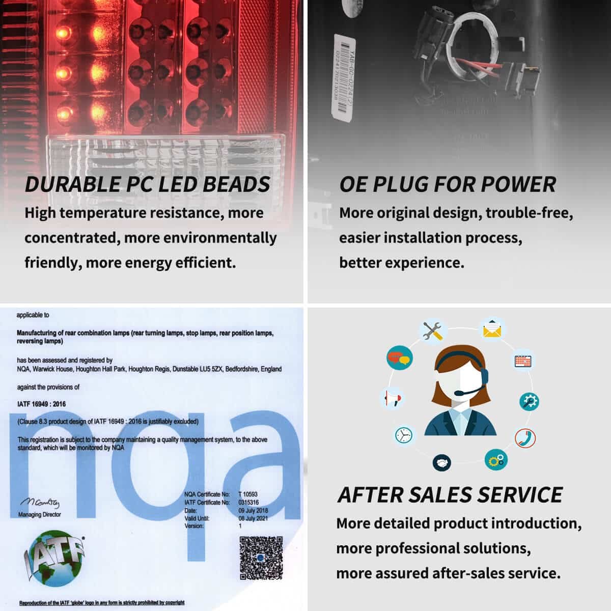 Our factory has American DOT, European E-Mark, and Chinese CCC certification to assure product quality. In terms of appearance, we have the appearance and design patents of our car lights. As for production capacity, our factory has IATF 16949 auto parts production management system and ISO 9001 quality management system certification standards.