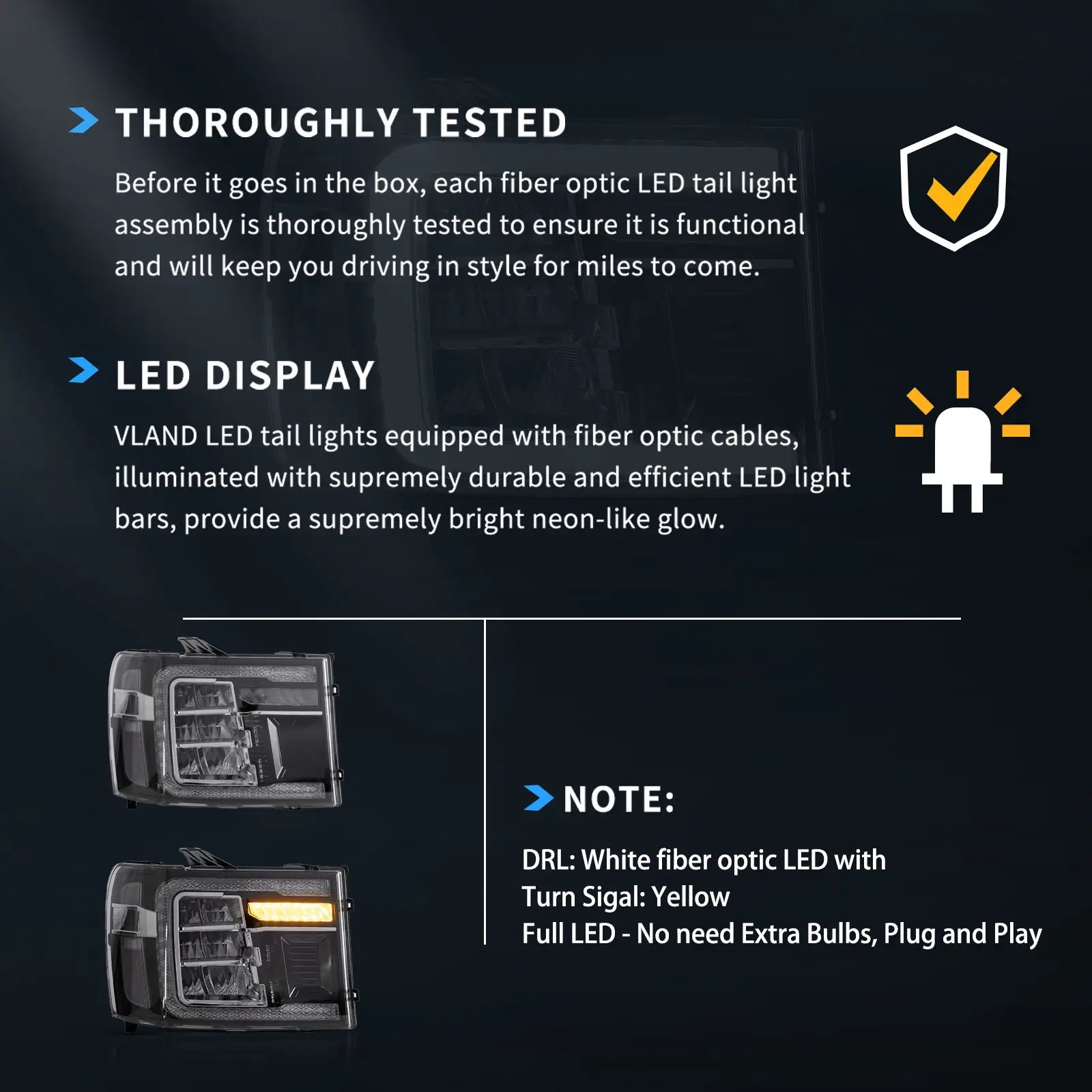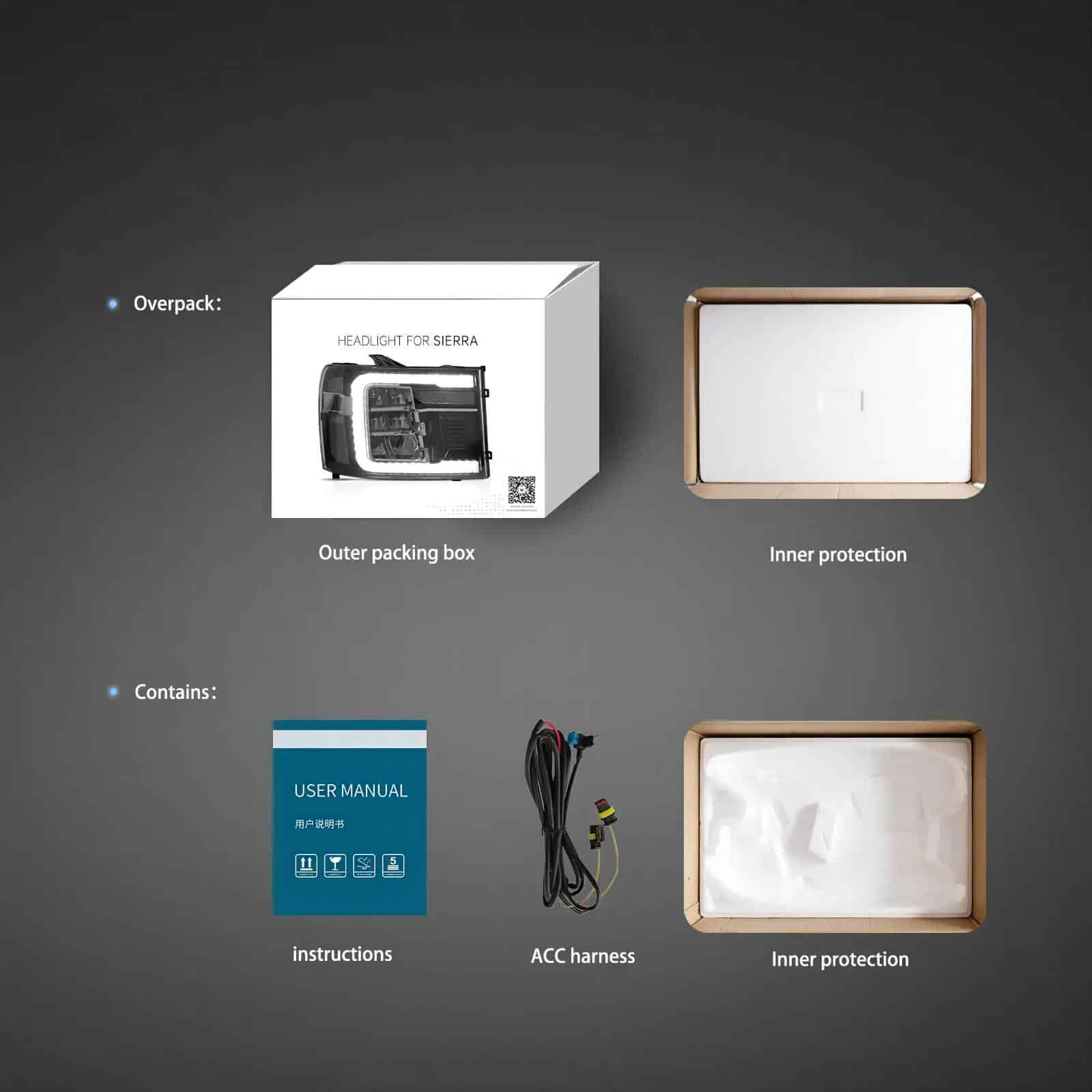 User manual*1,One pair of HeadLights (Include left side and right side),This item has the same connections and wires With the original HeadLights