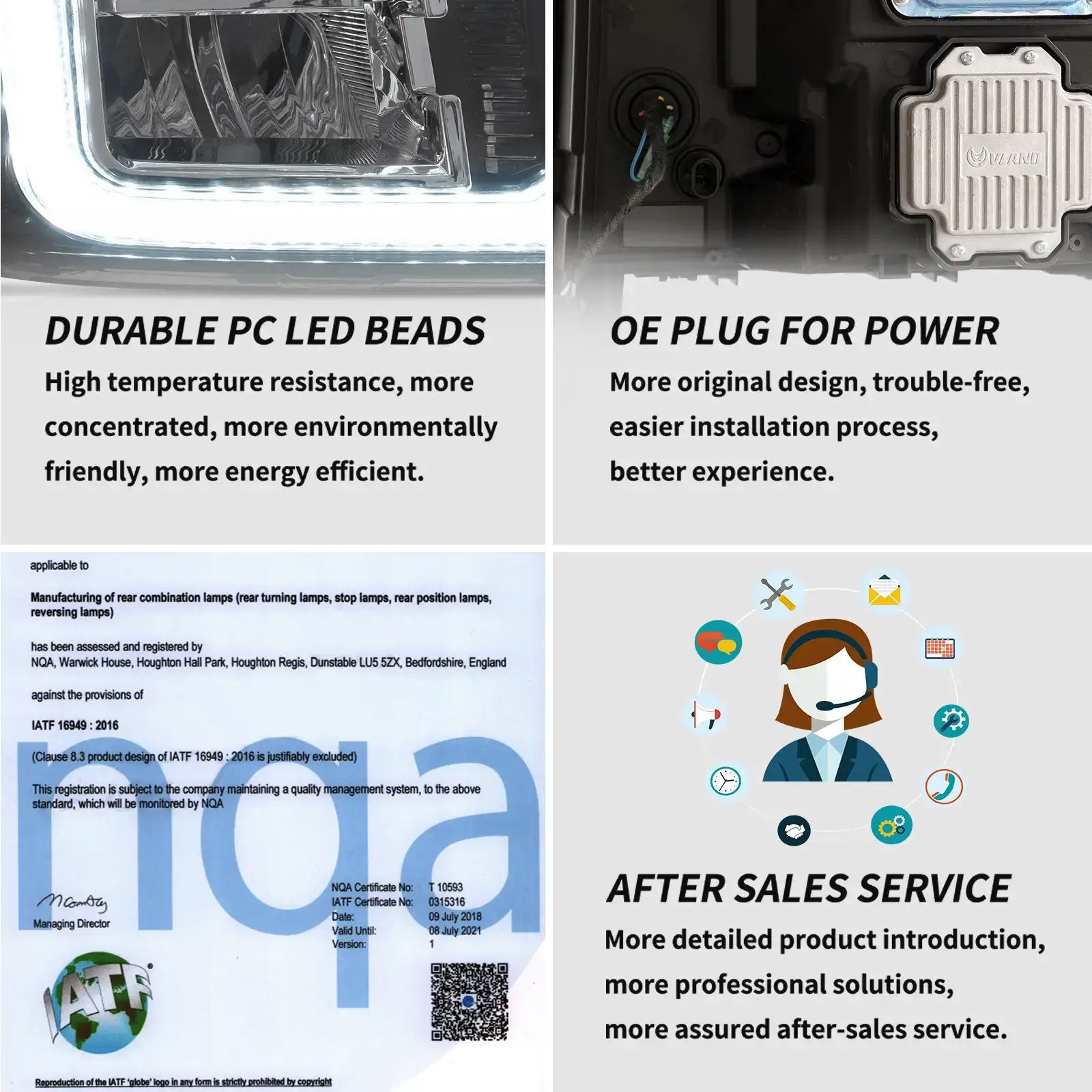 Our factory has American DOT, European E-Mark, and Chinese CCC certification to assure product quality. In terms of appearance, we have the appearance and design patents of our car lights. As for production capacity, our factory has IATF 16949 auto parts production management system and ISO 9001 quality management system certification standards.