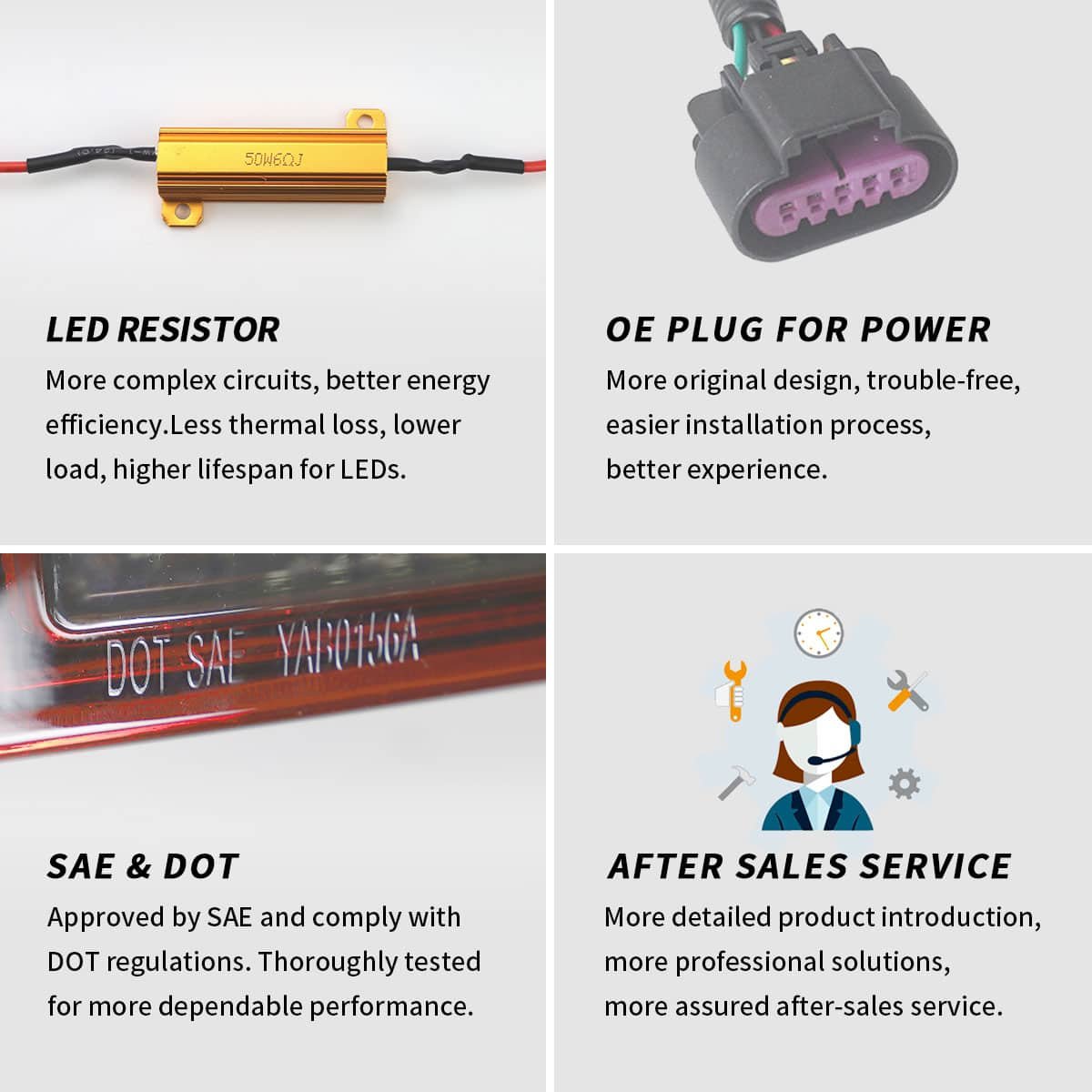 Our factory has American DOT, European E-Mark and Chinese CCC certification to assure product quality. In terms of appearance, we have appearance and design patents of our car lights. As for production capacity, our factory has IATF 16949 auto parts production management system and ISO 9001 quality management system certification standards.