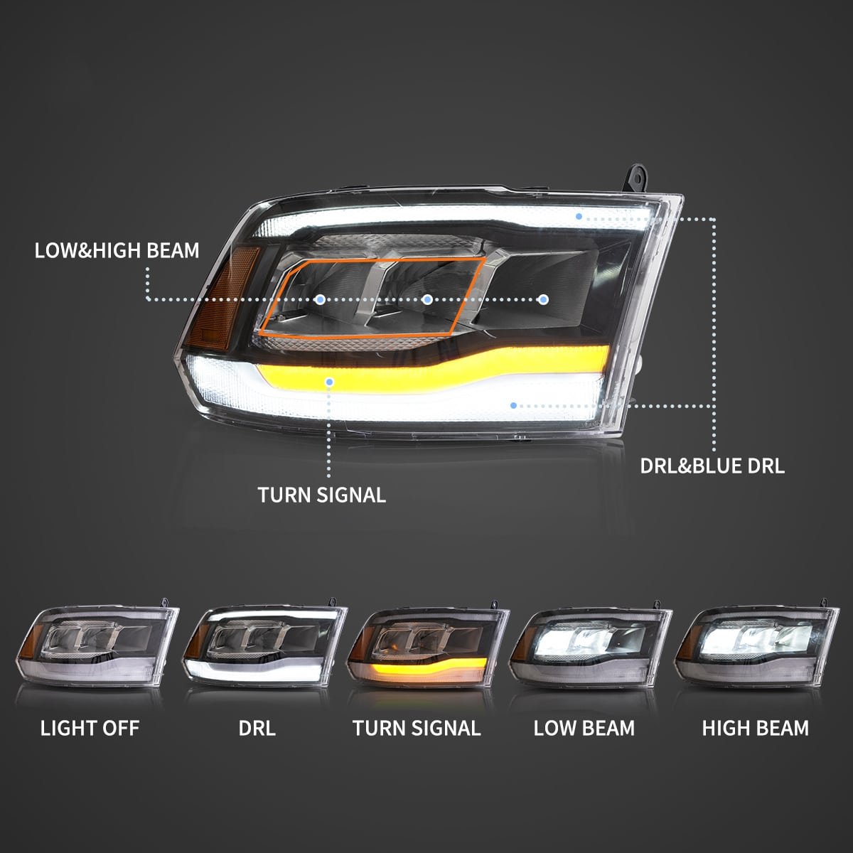 Dodge Ram 1500 2009-2018 With Stock Both Dual Beam And Quad Beam HeadLights