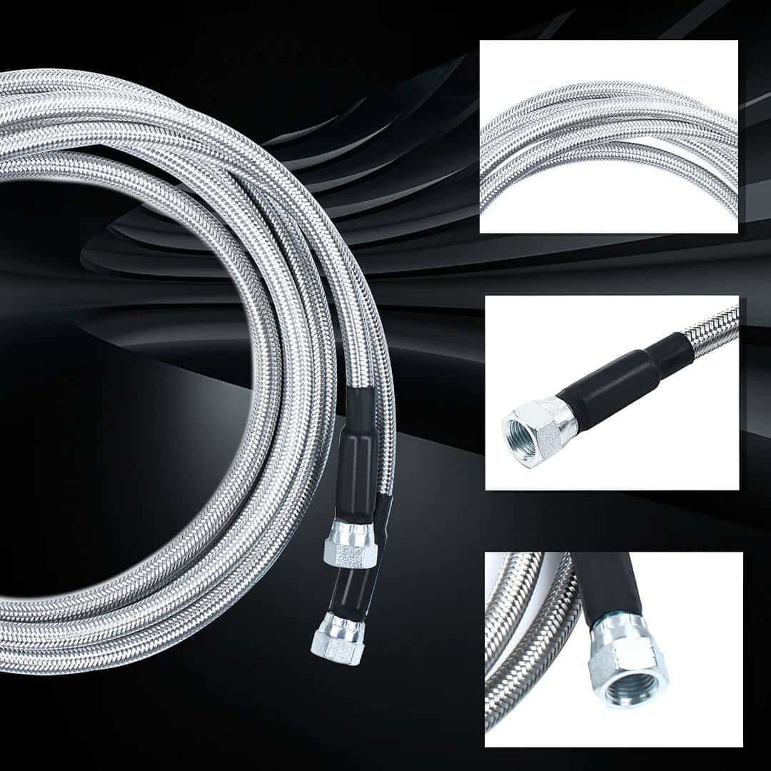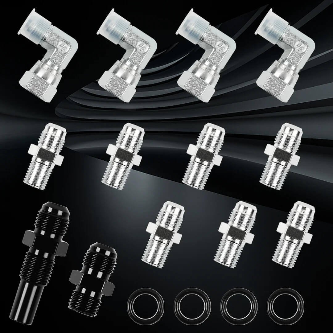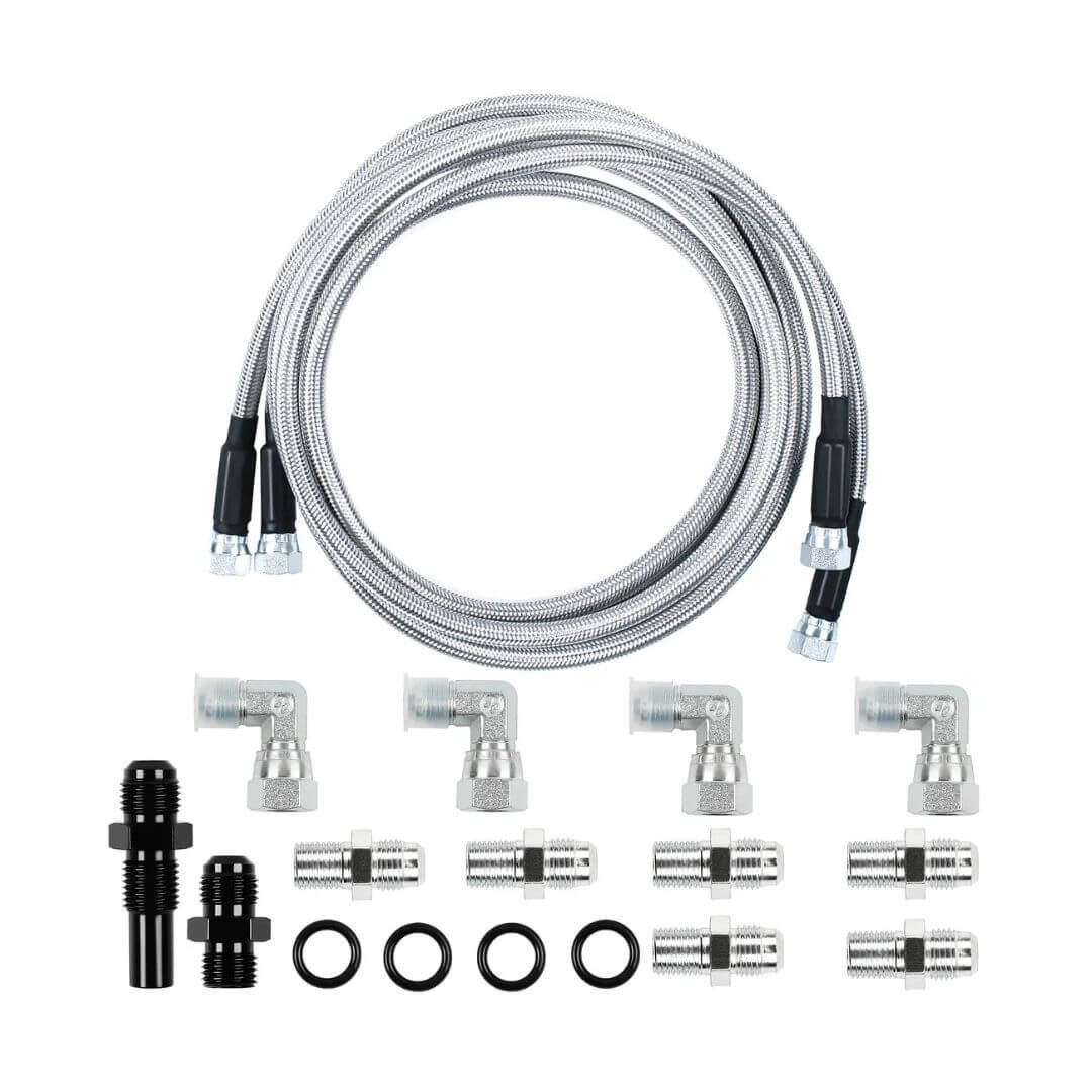 • Package Included: 2x 70″ & 3/8″ I.D. Stainless Steel Braided Hoses; 2x AN-6 flared to 3/8″ NPT billet adaptors; 2x Aluminum 4L80E adapter fittings; 4x AN-6 flared to 1/4″ NPT billet adapters; 4x 90 degree AN-6 inverted flare to AN-6 flare billet adapters