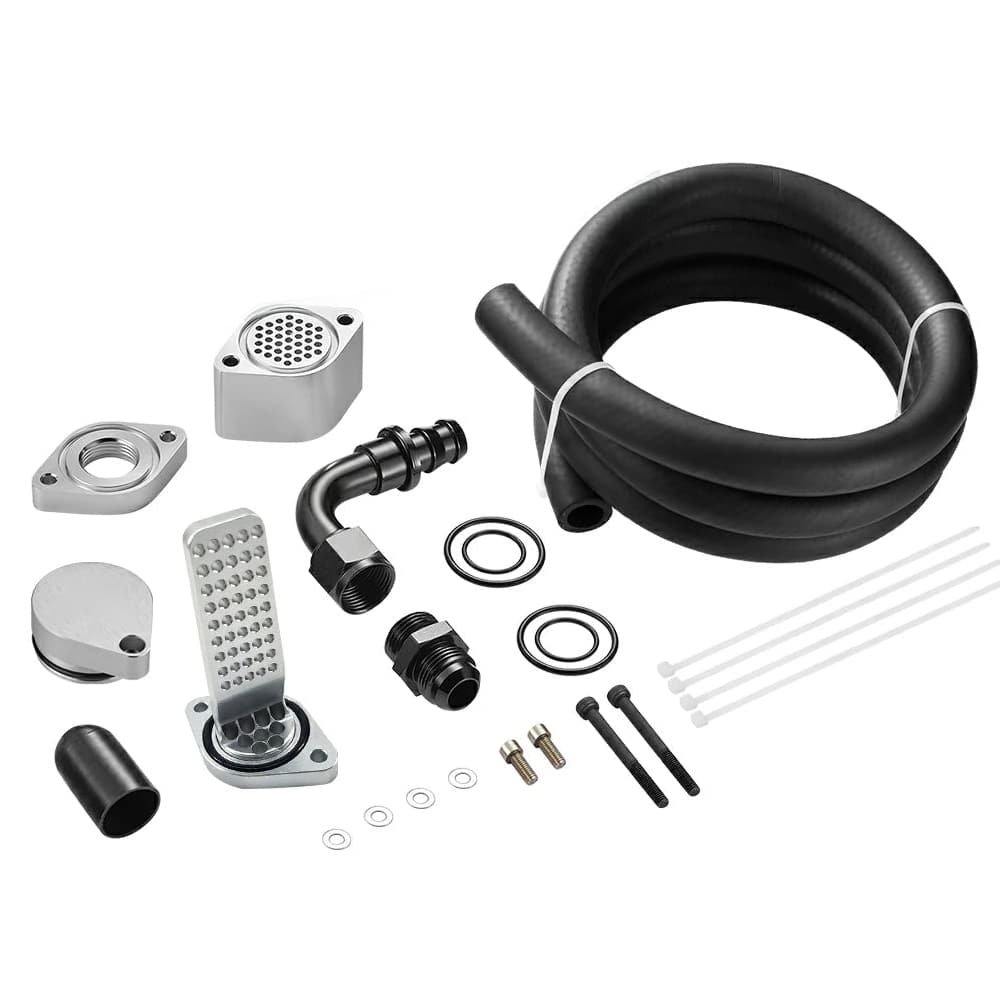 Function CCV Reroute + Catch Can(SKU:SPKT26010):Can complete CCV reroute function and has the effect of cooling and reflow(6 Feet 3/4‘’ Hose)+ CCV Internal Catch Can(remove oil molecules from the crankcase vent vapor)